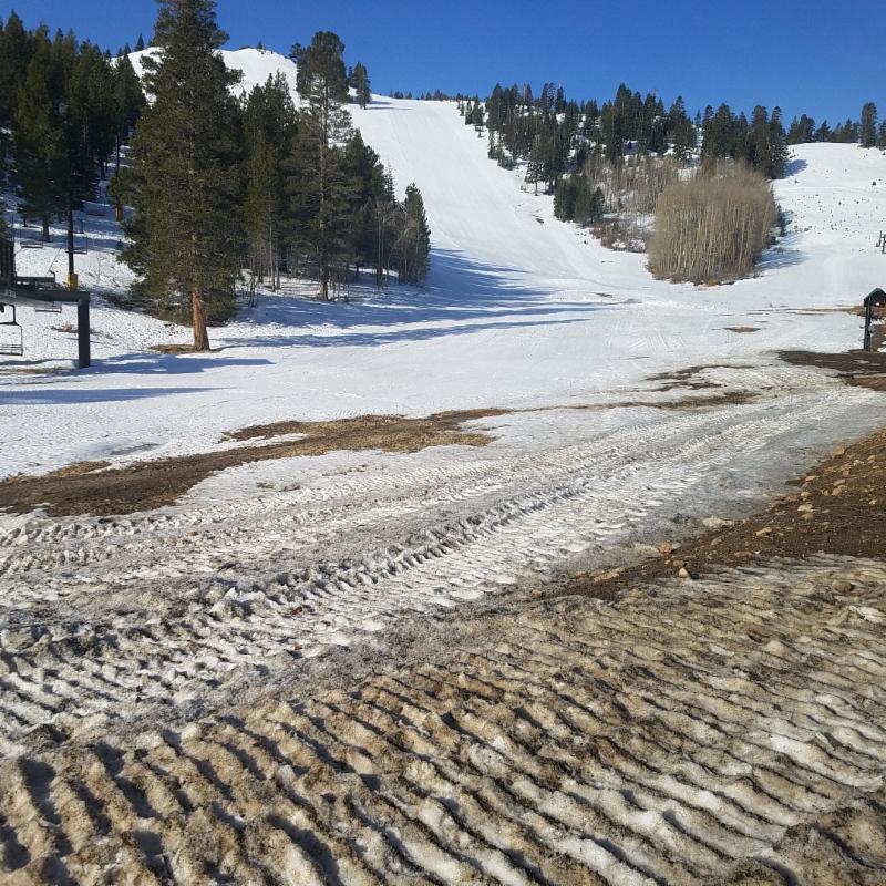 We knew it was coming and knew it was not going to be good. Thursday Jim and Mike went out and groomed all the steep slopes so water would flow down them and not sink into the snow. Next it rained and rained. Any water that fell from here to the Mt.Rose summit ended up in Tamarack Creek that flows right through the base area. It overflowed and put a foot or more of water on the foot of snow we had in the flat areas. Instant slushy. Someone on Facebook said they wanted theirs with watermelon syrup.